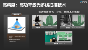 royal皇家88自主开发高功率激光多线扫描技术,在同一台相机上可实现多线扫描、面结构光扫描,既保证高精度,又提高扫描速度。该技术具备使用简单,不需要配合位移的机械结构、高精度、能直接生成场景的完整点云、抗反光能力强、能够兼容面结构光等特点。